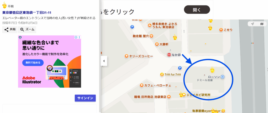 「大島てる」で住所やマンション名を検索したところ、該当する炎マーク(事故履歴)が登録されています。事件・自殺・火災などの投稿履歴があり、これまで事故物件として扱われた可能性が高いです。