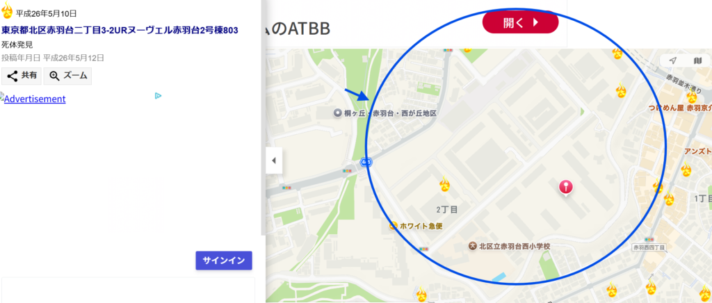 「大島てる」で住所やマンション名を検索したところ、該当する炎マーク(事故履歴)が登録されています。事件・自殺・火災などの投稿履歴があり、これまで事故物件として扱われた可能性が高いです。