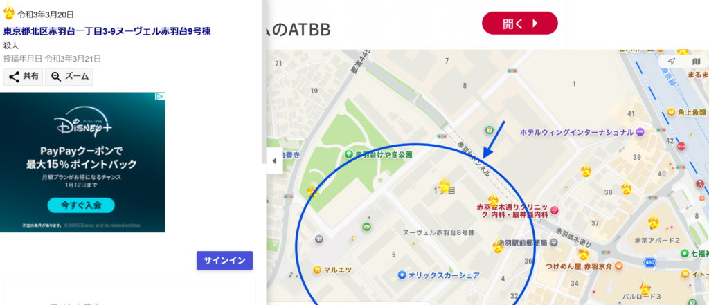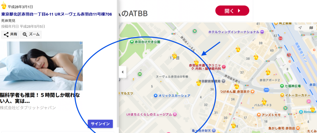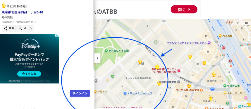 次に有名なのが、「大島てる」という事故物件情報サイトです。地図上に「炎のマーク」で事件・事故の発生場所が表示され、全国の事故物件を確認できます。