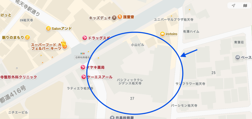 (地図上では旧名の「パシフィックレジデンス祐天寺」と記されていますが、現在のレジディア祐天寺を示しています。)