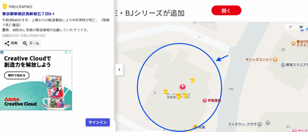次に有名なのが、「大島てる」という事故物件情報サイトです。地図上に「炎のマーク」で事件・事故の発生場所が表示され、全国の事故物件を確認できます。